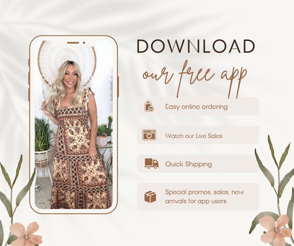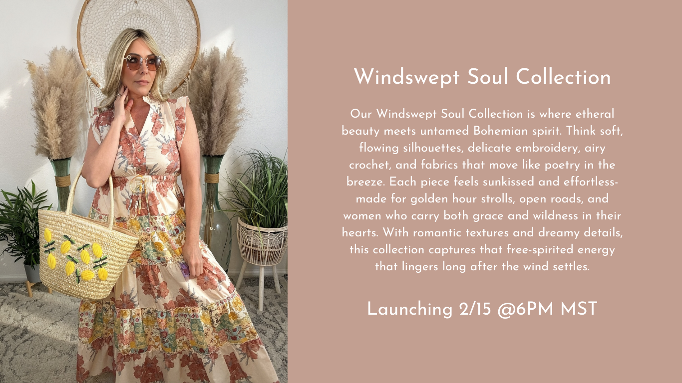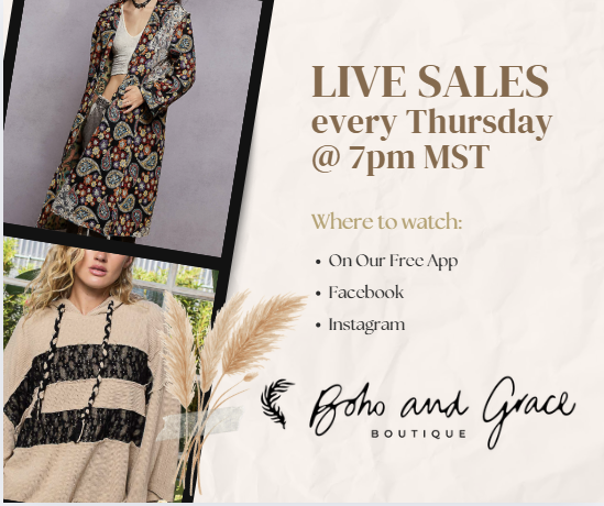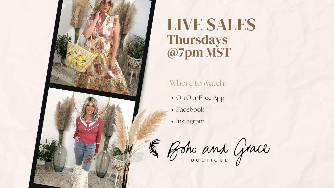 for our Live Sales--a weekly gathering of style, community, and feel-good energy. It's where new arrivals debut, exclusive deals drop, and your next favorite outfit finds you. Come hang out, laugh with us, shop in real time, and be part of a community of women who uplift, inspire, and celebrate each other. Whether you're here for the fashion, the fun or the freedom to express your style, Thursday nights are where it all comes to life. Don't miss the chance to claim the pieces you love before they're gone--your next boho moment is waiting.