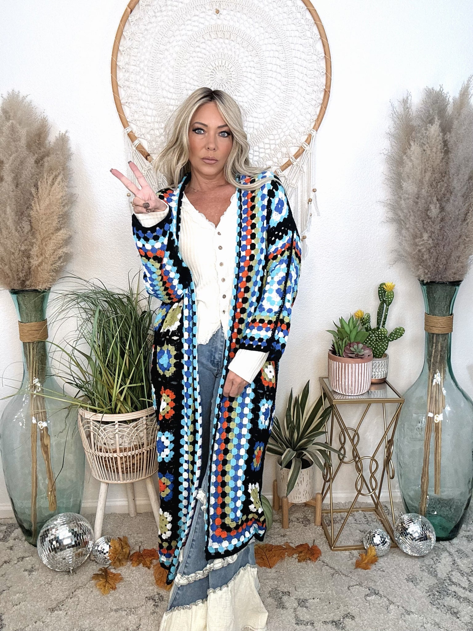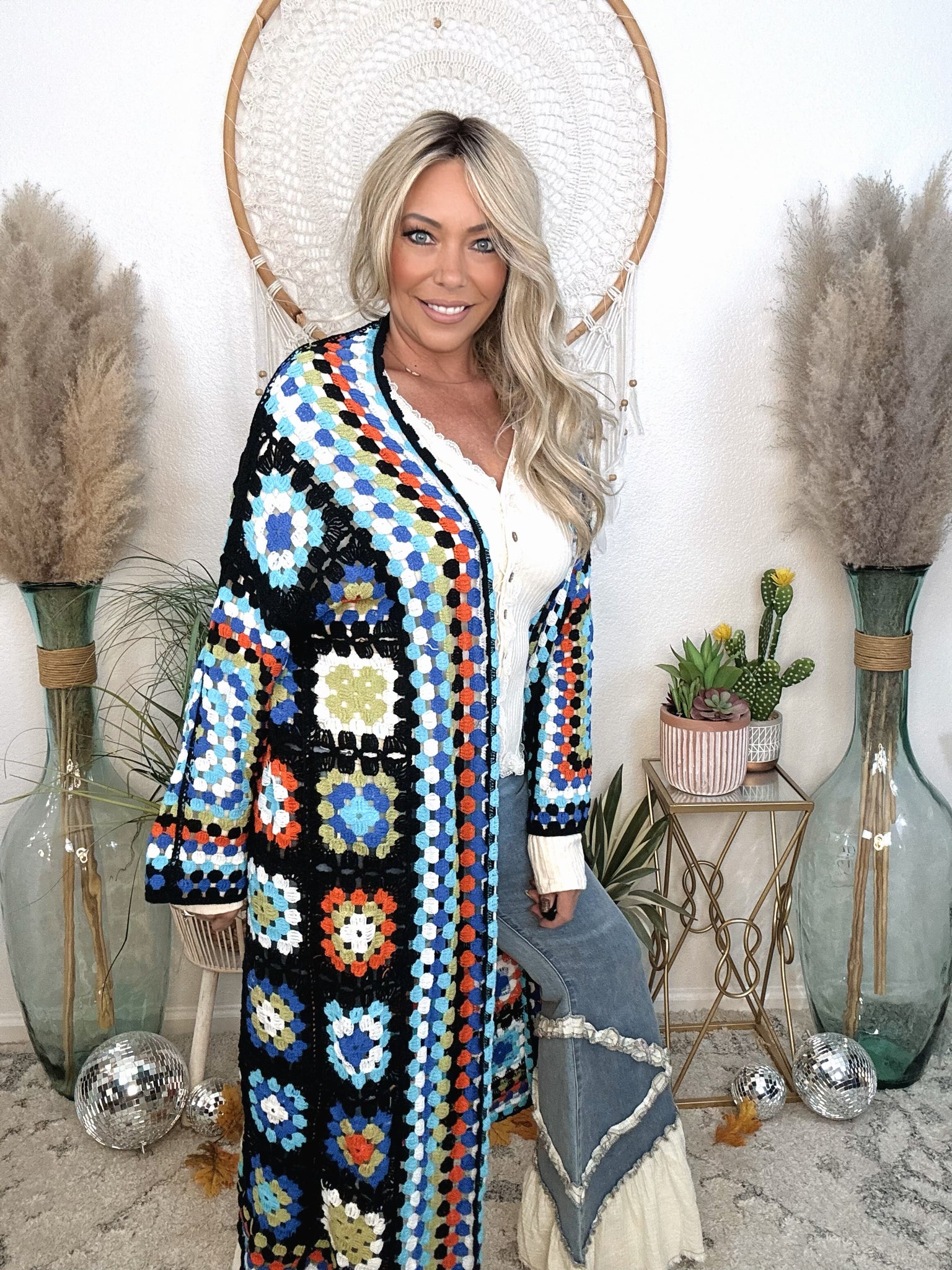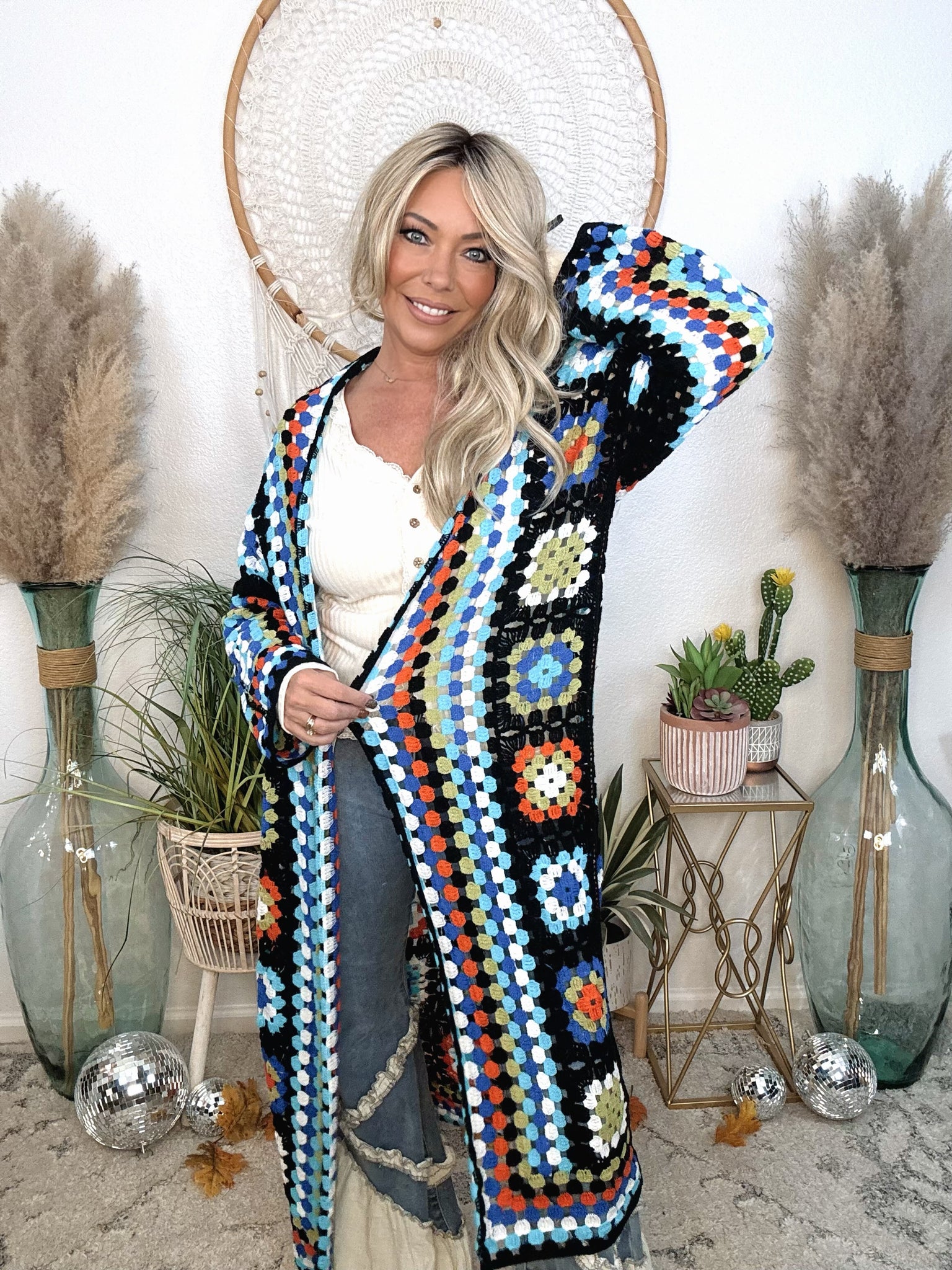 Embrace your free-spirited side with our Soulful Wanderer Crochet Duster. This long-sleeve cardigan features a roomy fit, vibrant colors, and intricate crochet and knit patterns. Perfect for adding a boho touch to any outfit.