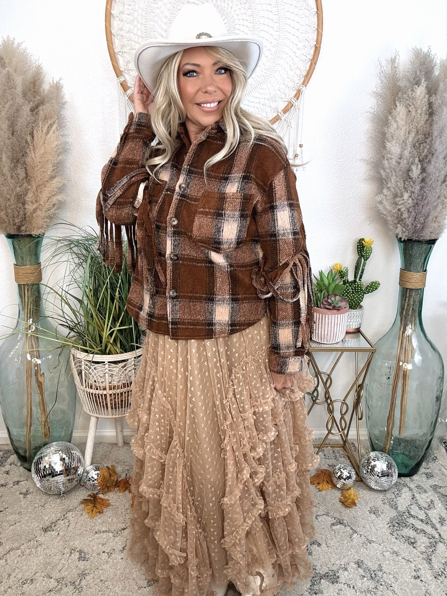 Wrap yourself in cozy charm with the Western Whimsy Plaid Jacket, featuring playful fringe and vibrant fall colors that capture the season’s spirit. This jacket adds a fun, rustic twist to your outfit while keeping you comfortably stylish on crisp autumn days. Perfect for layering and showing off your carefree, adventurous side.