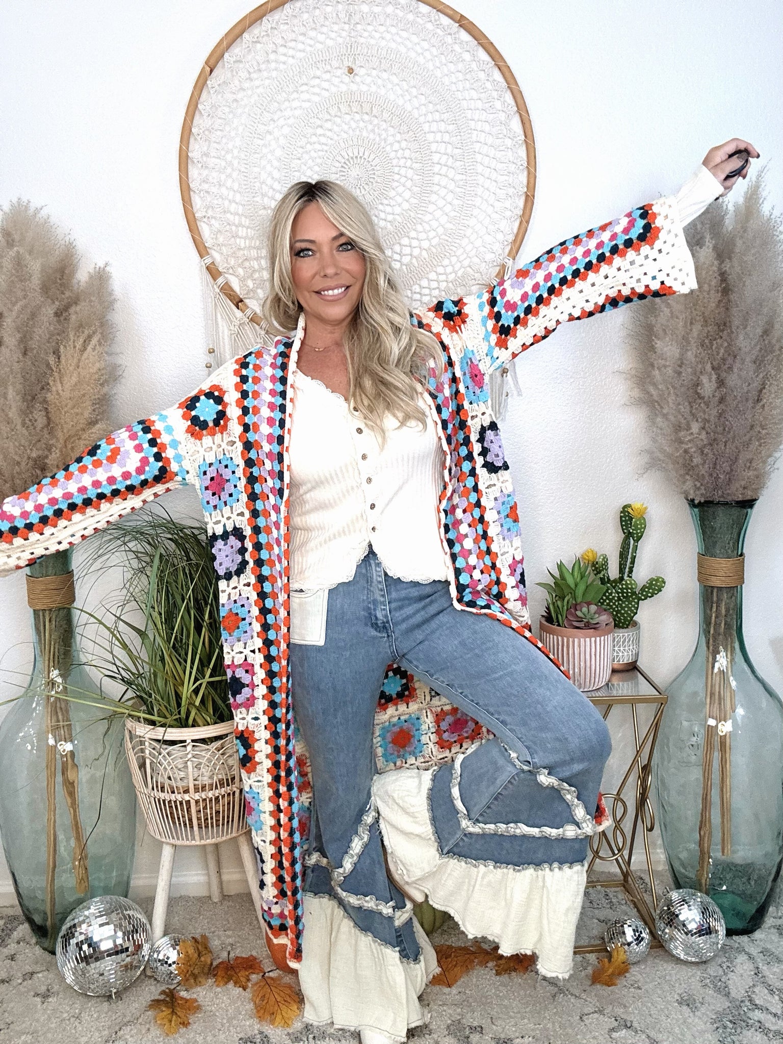 Embrace your free-spirited side with our Soulful Wanderer Crochet Duster. This long-sleeve cardigan features a roomy fit, vibrant colors, and intricate crochet and knit patterns. Perfect for adding a boho touch to any outfit.