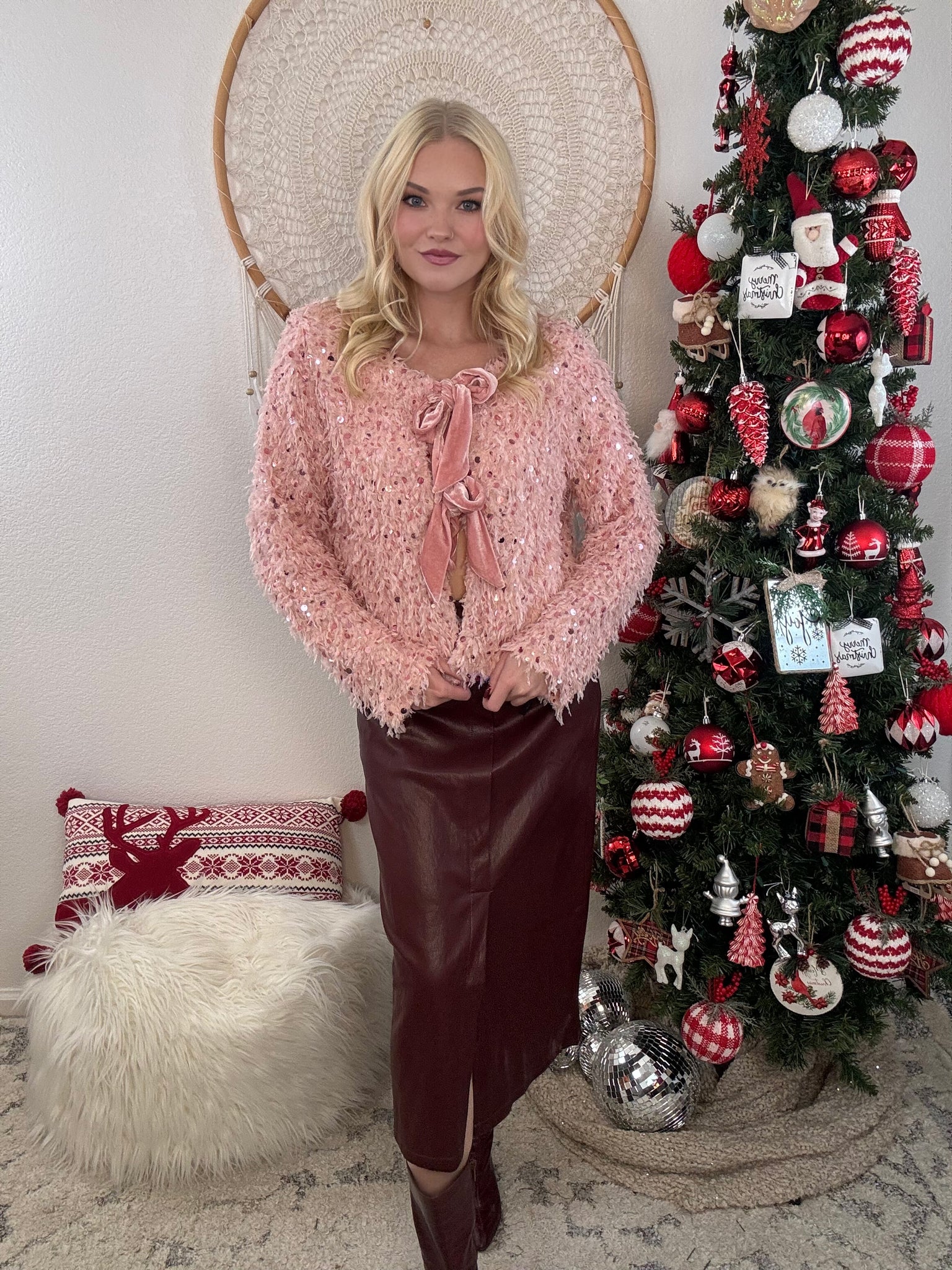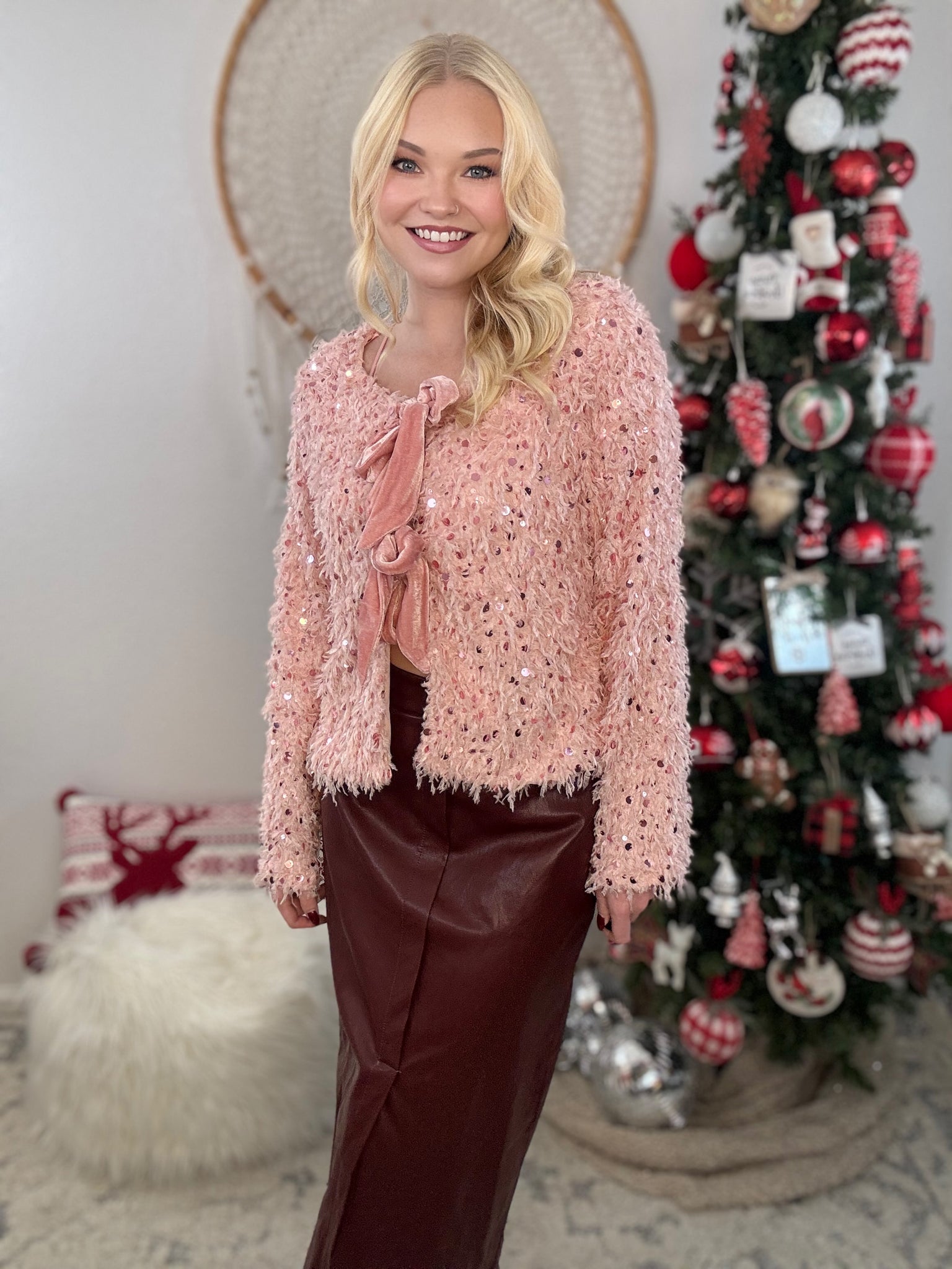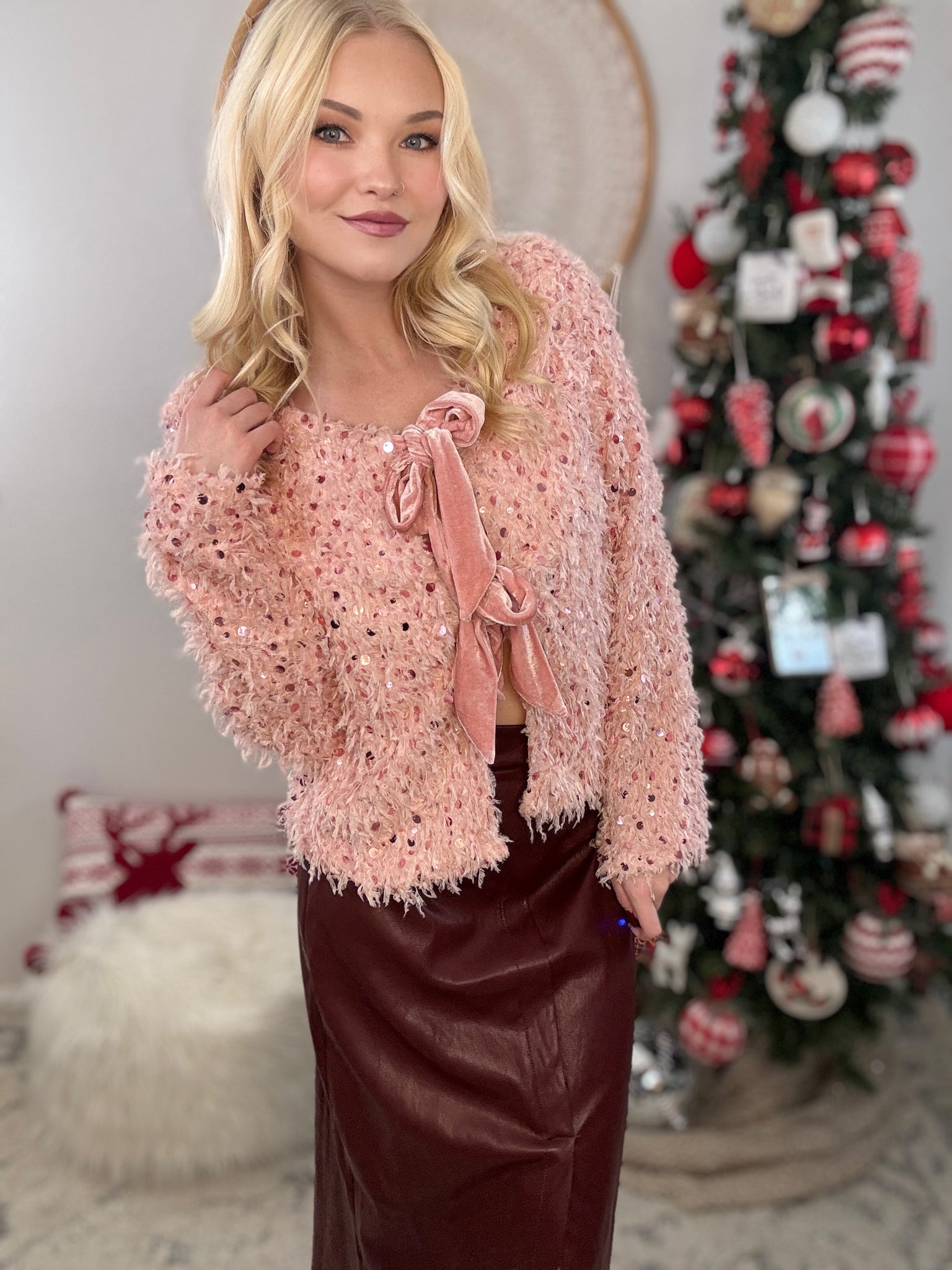Wrap yourself in festive sparkle with The Glimmer Knit Cardigan. Soft fuzzy sequins catch the light for a dazzling holiday look, while elegant velvet ribbon ties add a charming touch to the front closure. Perfect for cozy nights and joyful celebrations, this cardigan brings warmth and shine to your seasonal wardrobe with a festive flair.