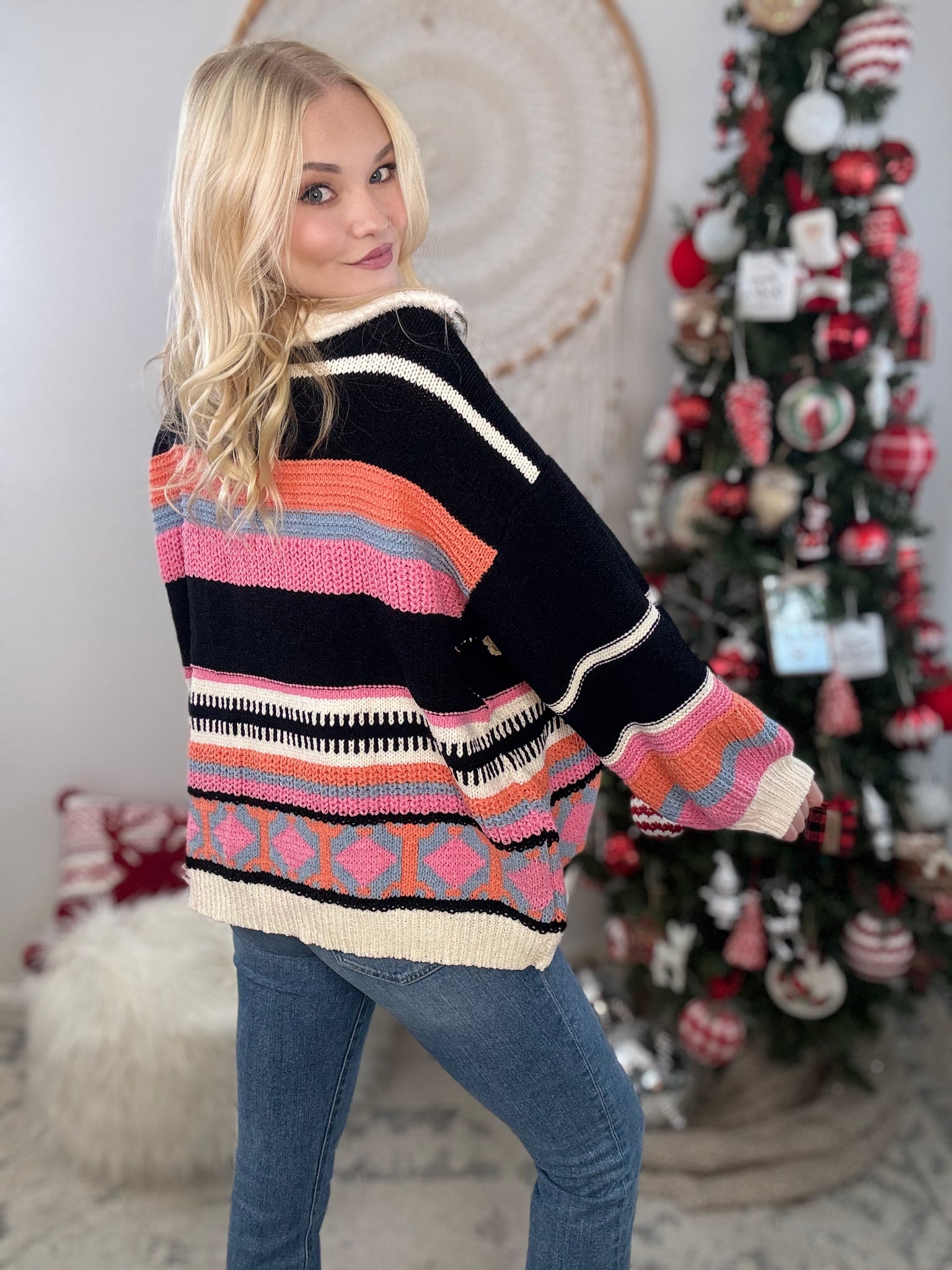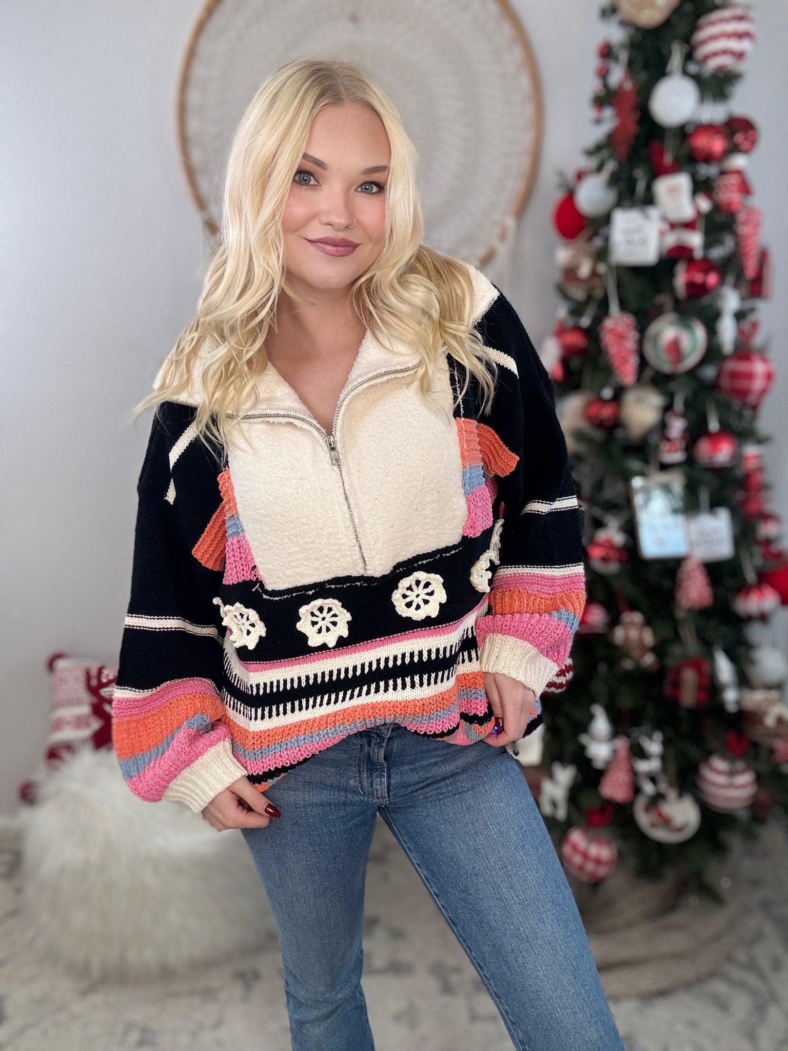 The Aspen Patchpoint Pullover brings cozy charm with its half-zip design and roomy fit. Crafted from soft chenille, it features playful balloon sleeves and a unique pointed striped patch detail that adds a fun twist to your everyday look. Perfect for layering or lounging in style.