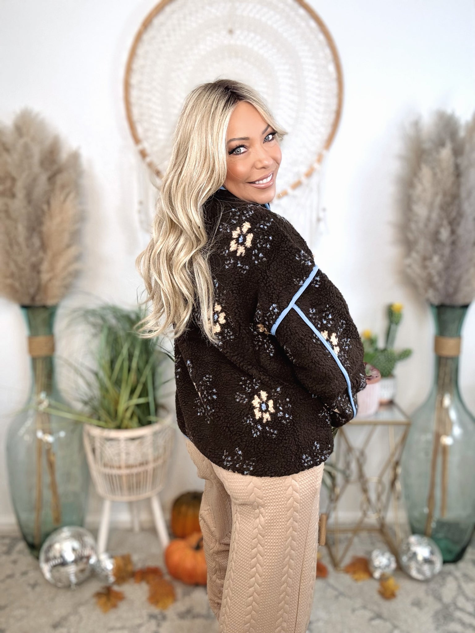 Introducing the Campfire Luxe Fleece Jacket, the perfect blend of style and comfort. This cozy fleece jacket features a zip front closure and pockets for practicality. The design showcases a beautiful mix of camel and floral, inspired by mountain landscapes and the warmth of a campfire. Perfect for a day at the ski lodge or a casual outdoor adventure.