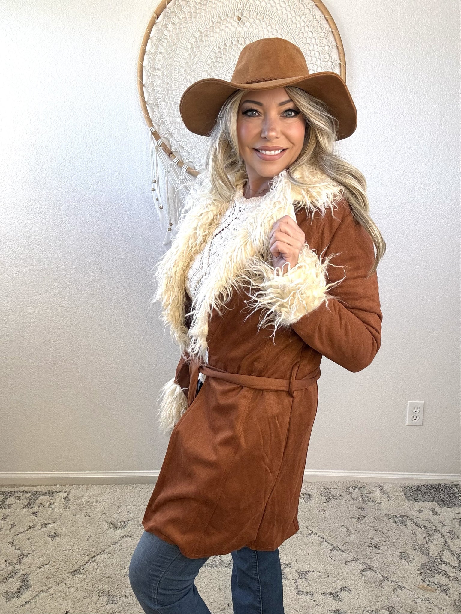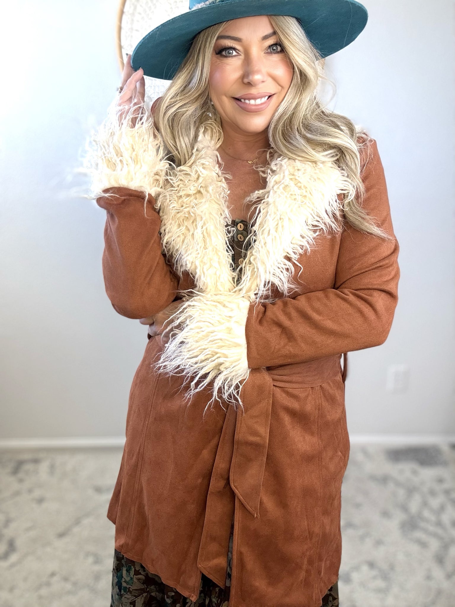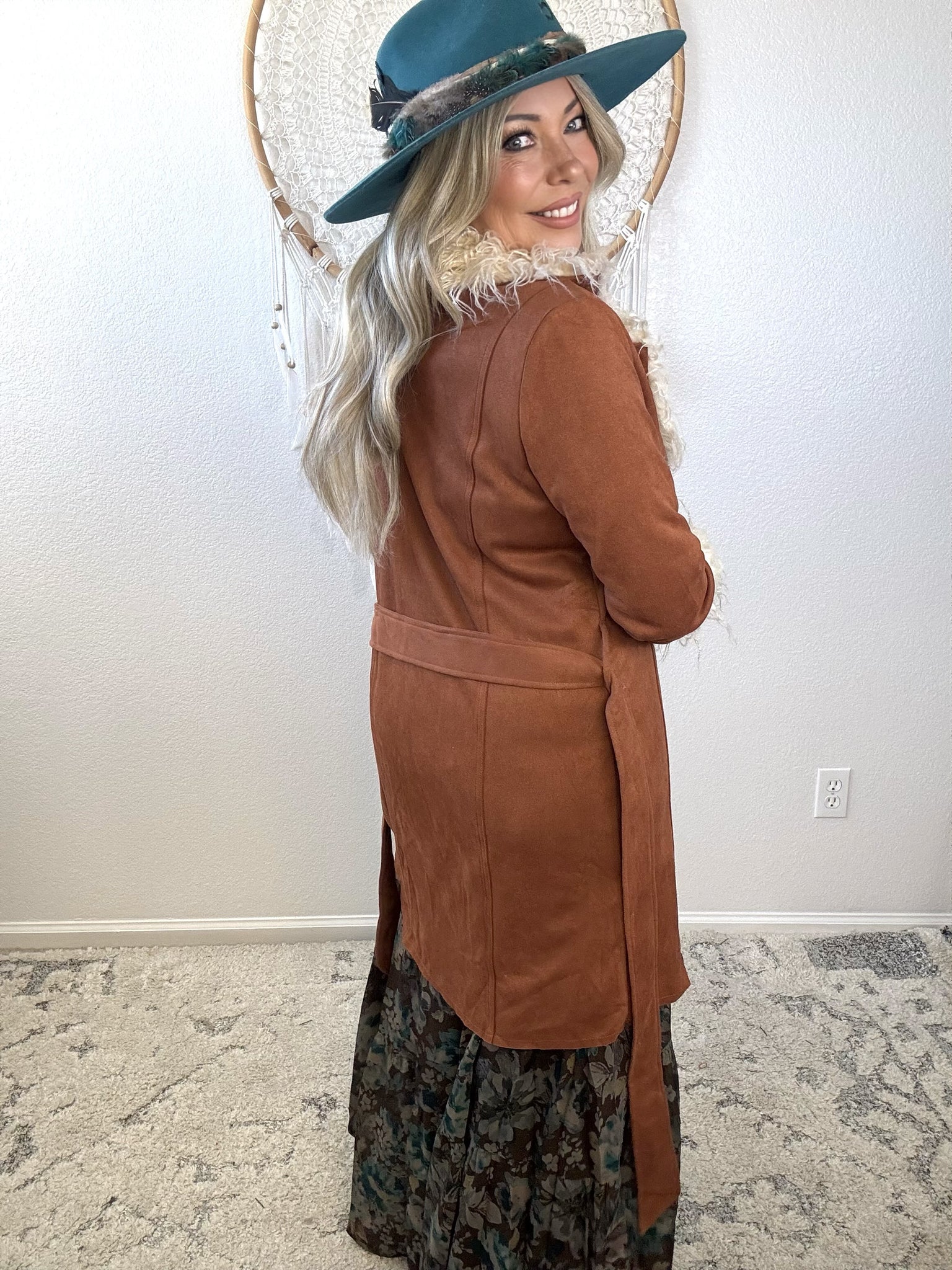 Embrace effortless elegance with this luxurious faux suede coat, designed for the modern bohemian spirit. The mid-length silhouette strikes a perfect balance between coverage and movement, while the plush fur collar and cuffs add a touch of refined glamour. Crafted for the winter wanderer who refuses to compromise on style, this piece layers beautifully over your favorite pieces and transitions seamlessly from city streets to mountain retreats. A timeless investment that captures wanderlust and understated sophistication.