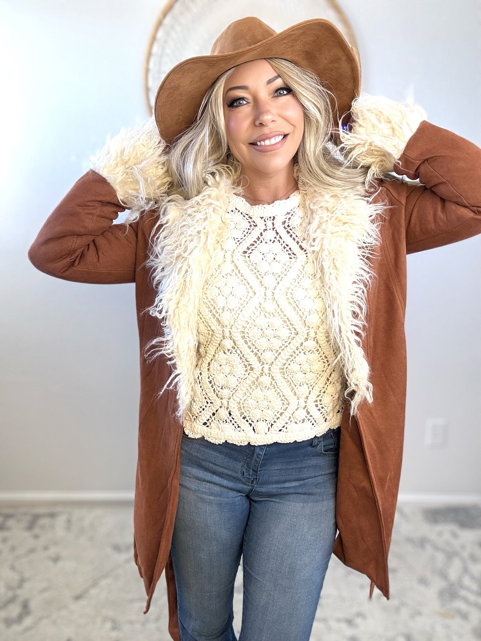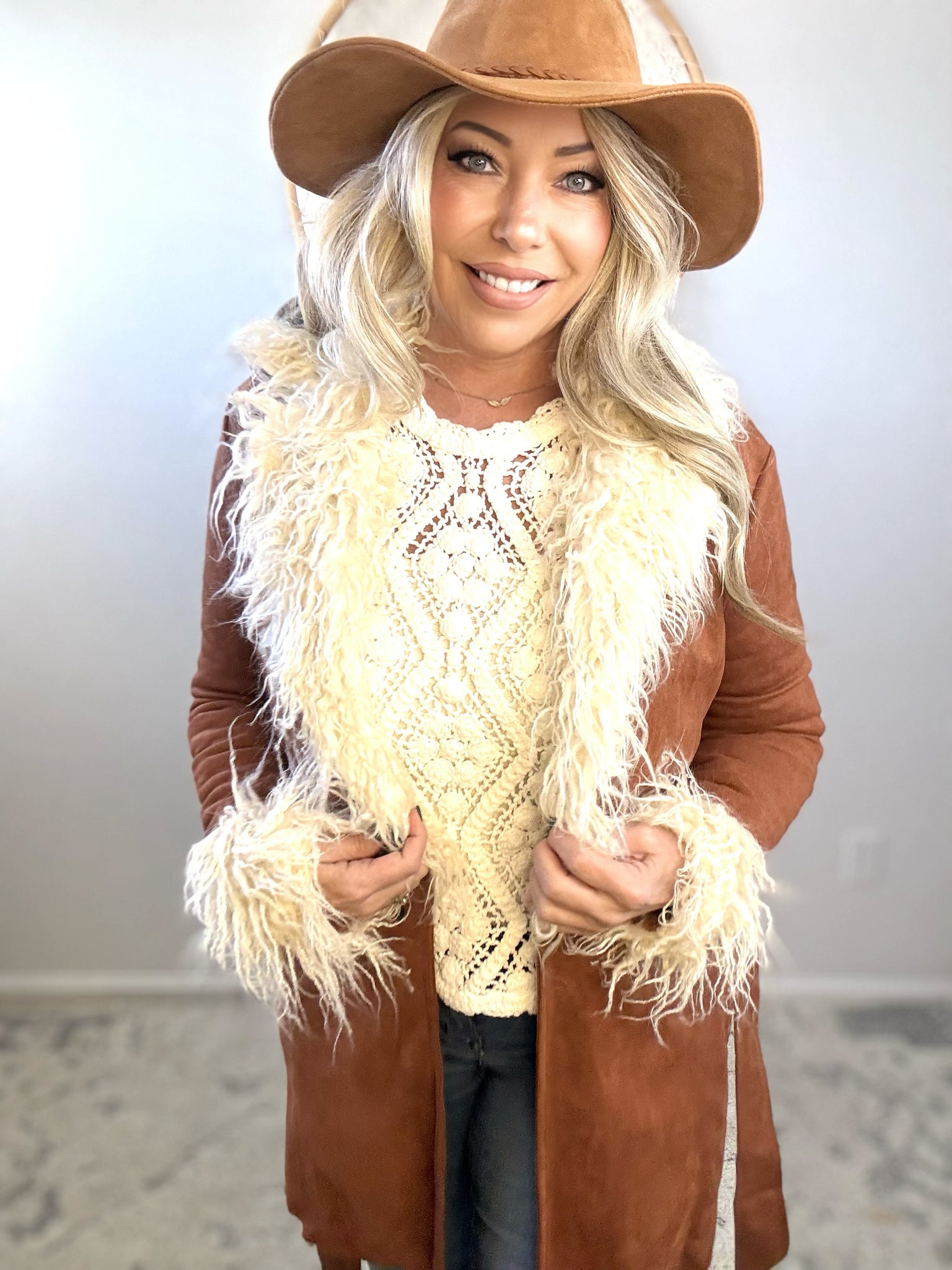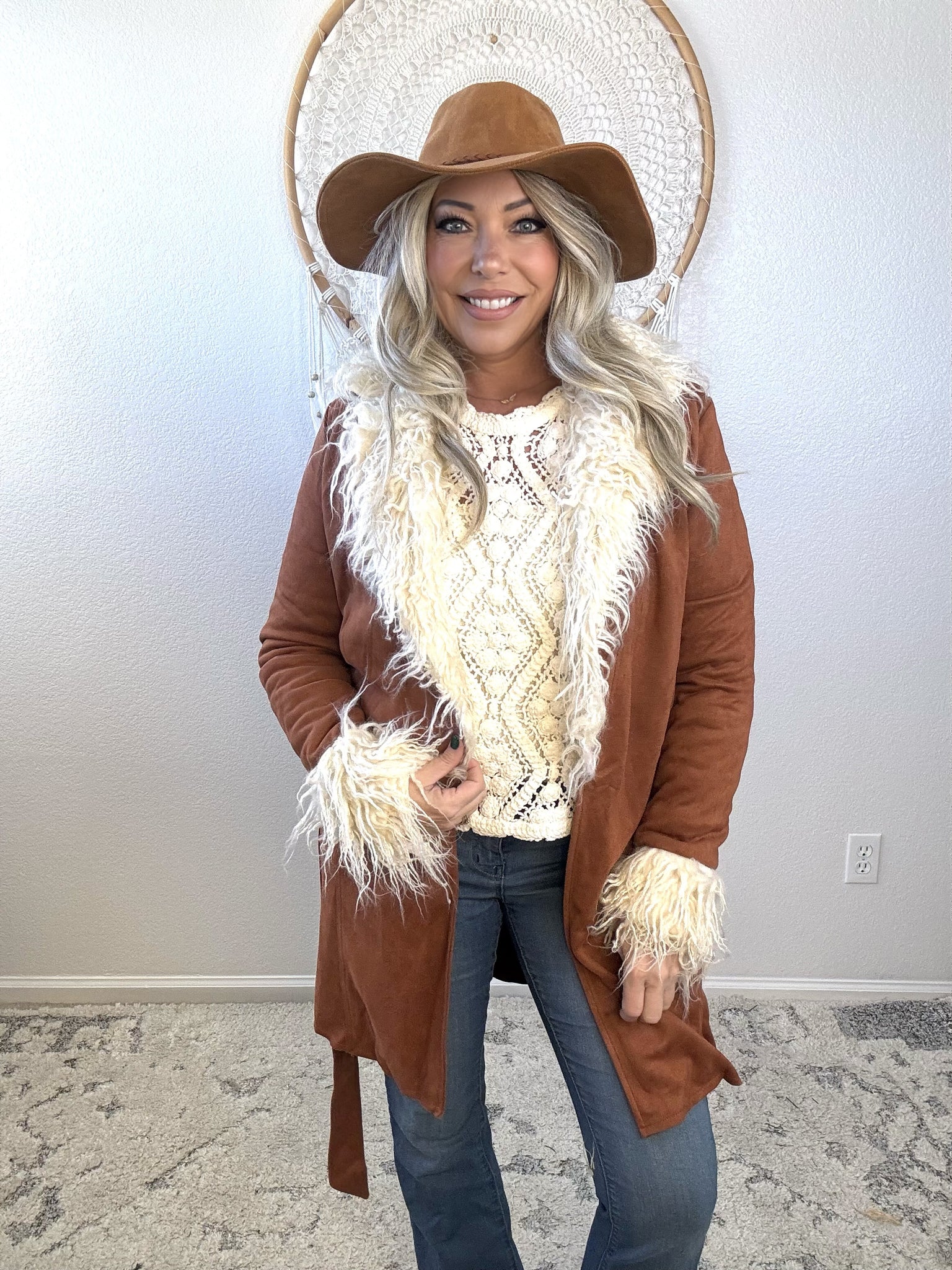 Embrace effortless elegance with this luxurious faux suede coat, designed for the modern bohemian spirit. The mid-length silhouette strikes a perfect balance between coverage and movement, while the plush fur collar and cuffs add a touch of refined glamour. Crafted for the winter wanderer who refuses to compromise on style, this piece layers beautifully over your favorite pieces and transitions seamlessly from city streets to mountain retreats. A timeless investment that captures wanderlust and understated sophistication.